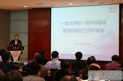 会上,常务副校长张四平受校长周绪红委托,从目前形势背景、学科现状、问题分析和工作部署四方面全面启动和部署实施一流大学和一流学科建设工作。他强调,2015年是国家全面深化改革的关键一年,也是学校综合改革的启动之年,是学校“十二五”发展规划的收官之年,也是谋划制定“十三五”规划的关键之年,针对学校面临的形势与要求,建设一流大学和一流学科是学校当前工作的重中之重。他指出,近两年国家相继出台文件,加大对学位授权点评估力度,建立学科退出机制,积极推动学位授权动态调整,注重优化学科结构,并统筹 “985工程”、“211工程”等重点建设项目,坚持中国特色、一流标准,推进一流大学和一流学科建设,并将对建设高校实行绩效评价,动态调整,这些措施将打破高校身份壁垒,加大高校之间的竞争,因此我校今后的建设和发展将面临严峻的挑战。接下来,他结合我校学科发展现状、985工程建设情况对我校现阶段存在的问题进行了分析,指出经过前期建设,我校各方面均取得了不同程度的进步,但仍存在学科建设缺乏规划的引领、重点不突出、缺乏有效的评估机制、学科布局亟待完善、学科分类发展不明确、学科队伍规模结构不合理、国际竞争力不强等问题。他指出,学校结合国家要求及存在的问题,决定在2015年开始实施一流学科重点建设计划,并启动新一轮学科建设规划工作,重点建设计划将强调在每个一级学科制定建设规划的基础上,重点建设10-15个国内一流、国际知名的学科,充分发挥优势学科的辐射、示范作用,不断提升学科整体水平、不断提高学校综合实力、社会贡献力和国际竞争力。最后,他针对具体工作做了详细部署和安排。